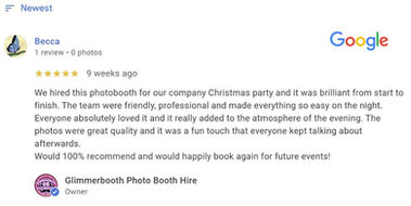 At Glimmerbooth we pride ourselves on customer service, quality and value. View our recent events and 90+ 5*reviews on google and at our facebook page
